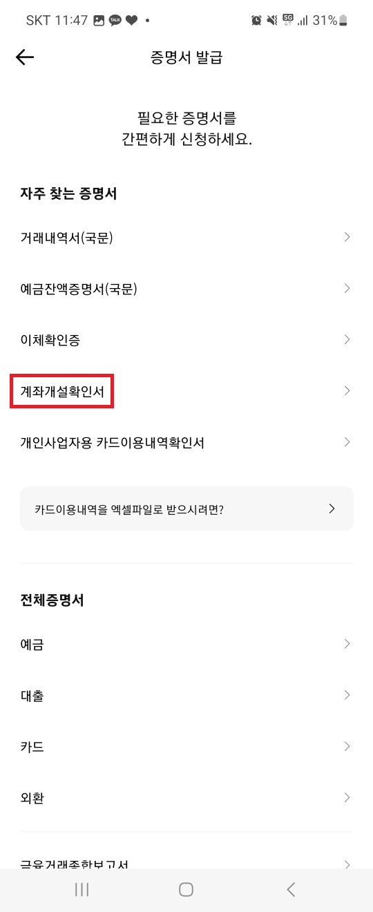 5. '계좌개설확인서' 클릭