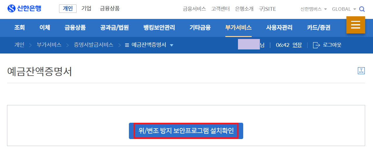 4. '부가서비스'에 커서를 올린 후 '예금잔액증명서' 클릭