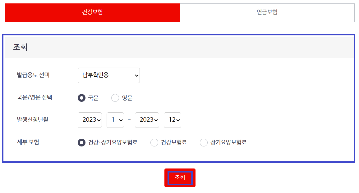 6. 발급용도 및 발행 신청년월 입력 후, '세부 보험'에 건강·장기요양보험료 선택되어 있는지 확인 그리고 '조회' 클릭