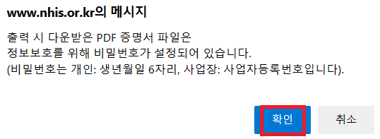 8. 자동으로 뜨는 메시지 읽은 후 '확인' 클릭 / 다운로드 된 PDF파일의 비밀번호는 자신의 생년월일 6자리입니다.