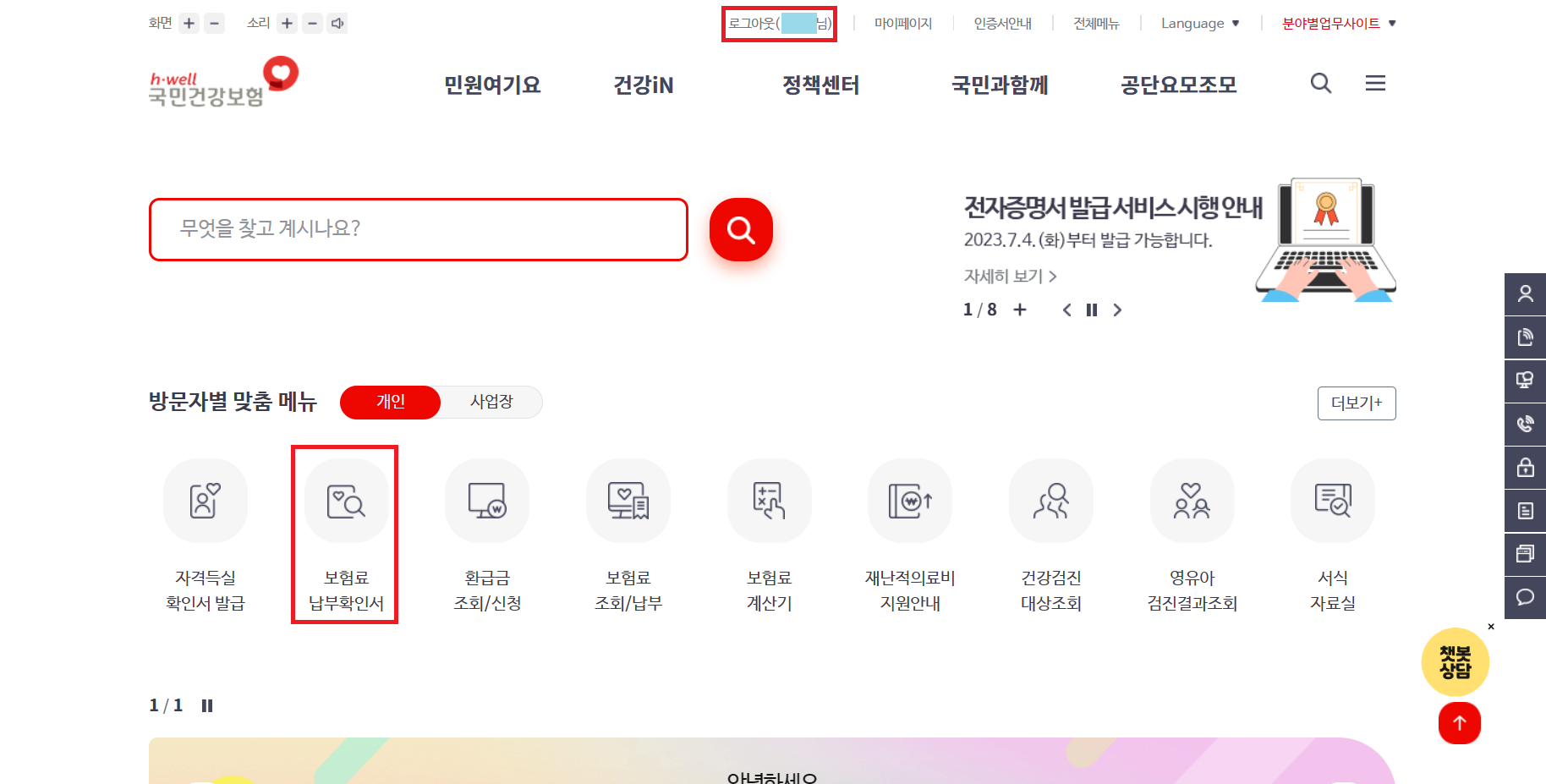 5. 로그인 됐는지 확인 후 '보험료 납부 확인서' 클릭