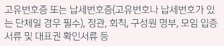 고유번호증 또는 납세번호증(고유번호나 납세번호가 있는 단체일 경우 필수), 정관, 회칙, 구성원 명부, 모임 입증 서류 및 대표권 확인 서류 등을 지참하여 근처 신한은행 영업점에 방문하면 됩니다.
