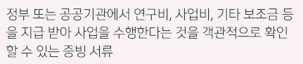 정부 또는 공공기관에서 연구비, 사업비, 기타 보조금 등을 지급 받아 사업을 수행한다는 것을 객관적으로 확인할 수 있는 증빙 서류를 지참하여 근처 신한은행 영업점에 방문하면 됩니다.