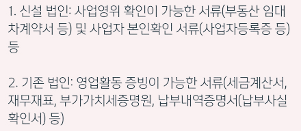 -신설 법인의 경우 사업영위 확인이 가능한 서류(부동산 임대차계약서 등) 및 사업자 본인확인 서류(사업자등록증 등) 등을 지참